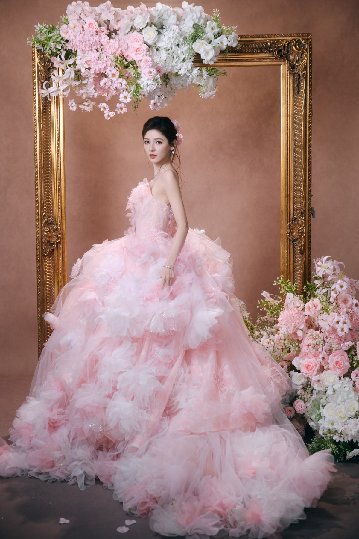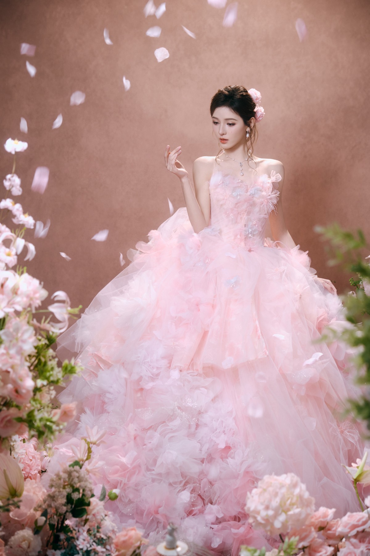 妆造团队这次真是细节控本控!发型看似随意挽起,实则暗藏心机:几缕碎发自然垂落,软化了整体轮廓;鬓边别着的小粉花,和裙子上的立体装饰遥相呼应,整套look浑然一体,毫无违和感。眼妆走的是“伪素颜天花板”路线——清透底妆打底,淡粉眼影轻轻扫过眼皮,眼尾微微上扬,不靠浓墨重彩,只靠光影层次就把眼神勾得又灵又媚。高光点在鼻梁和颧骨,不是油光满面,而是那种“刚睡醒但皮肤好到发光”的自然光泽。唇色选了低饱和柔粉,既没抢了纱裙的戏,又把温柔气质稳稳托住。每一帧都写着四个大字:高级浪漫。