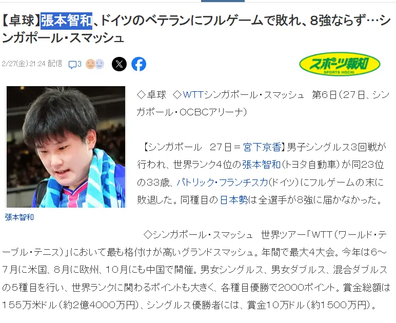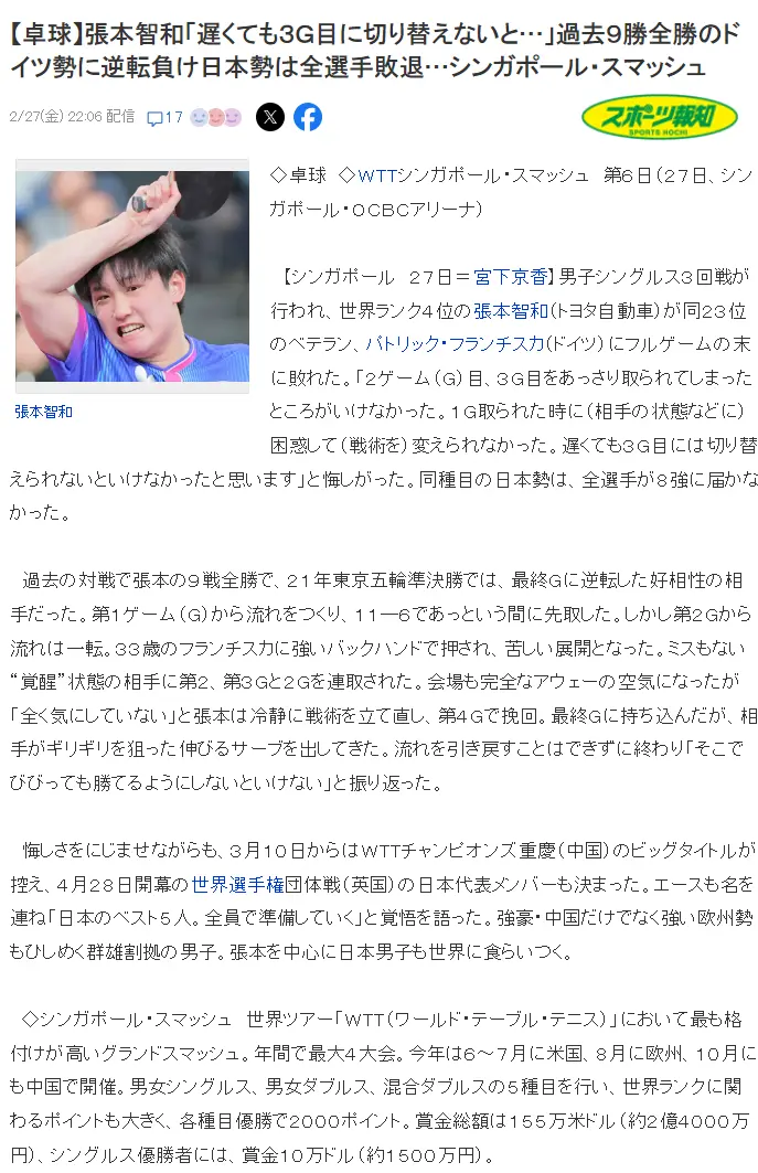 这场比赛后《日本媒体》写道:张本智和无缘八强提前败走,日乒男队无一人进入新加坡 大满贯八强,他输给了德国33岁老将弗朗西斯卡,此前张本智和与弗朗西斯卡的交手记录是9战全胜。(所以这场比赛算是屈辱一败)